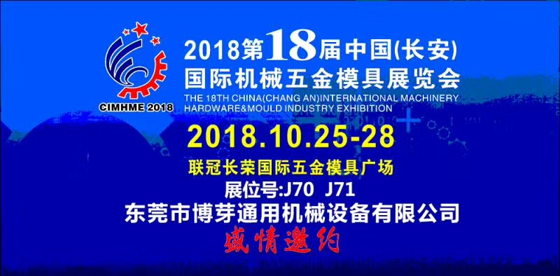 展會名稱:第18屆中國(長安)國際機械五金模具展覽會時間:2018年10月25-28日地點:廣東省東莞市主辦方:廣東亞聯展覽股份有限公司展會地址:聯冠長榮國際五金模具廣場備注:18年J70J71...